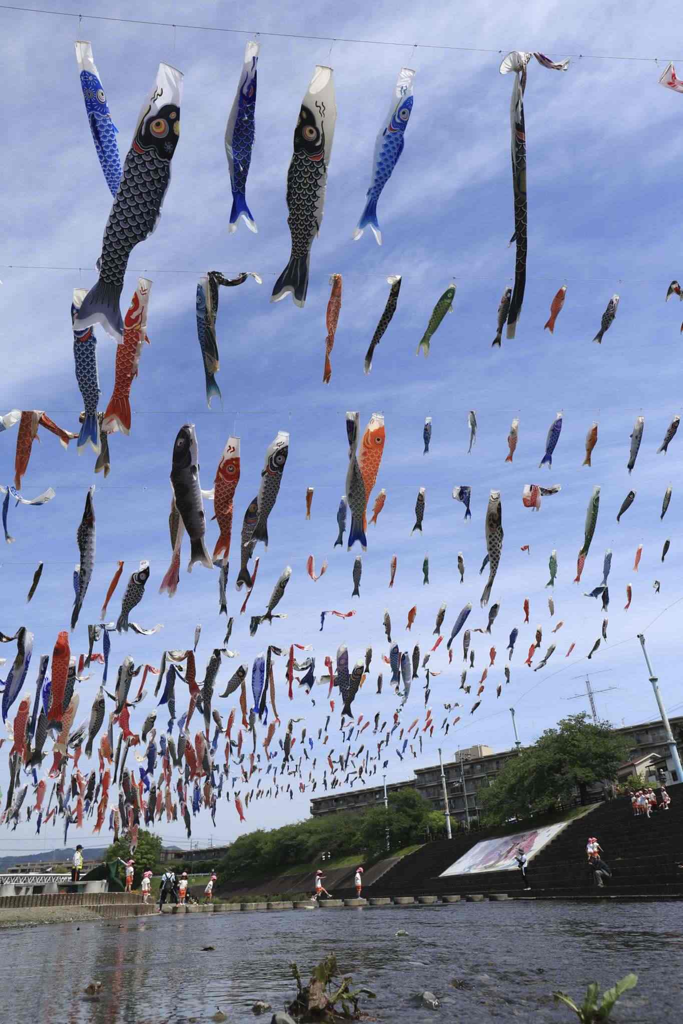當(dāng)?shù)貢r間2023年4月28日,日本大阪,大約1000條鯉魚旗在高摫市的秋田川河上空飄揚,慶祝5月5日兒童節(jié)。視覺中國