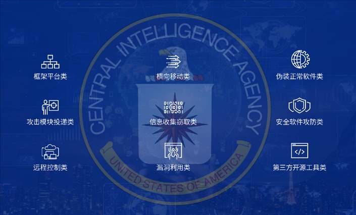 國家病毒應(yīng)急處理中心和360公司通過進(jìn)一步技術(shù)分析發(fā)現(xiàn),盡管CIA的后門程序和攻擊組件大都以無實(shí)體文件的內(nèi)存駐留執(zhí)行的方式運(yùn)行,這使得對相關(guān)樣本的發(fā)現(xiàn)和取證難度極大。即使這樣,聯(lián)合技術(shù)團(tuán)隊(duì)還是成功找到了解決取證難題的有效方法,發(fā)現(xiàn)了CIA所使用的9個類別的攻擊武器,包括攻擊模塊投遞類、遠(yuǎn)程控制類、信息收集竊取類、第三方開源工具類等。
