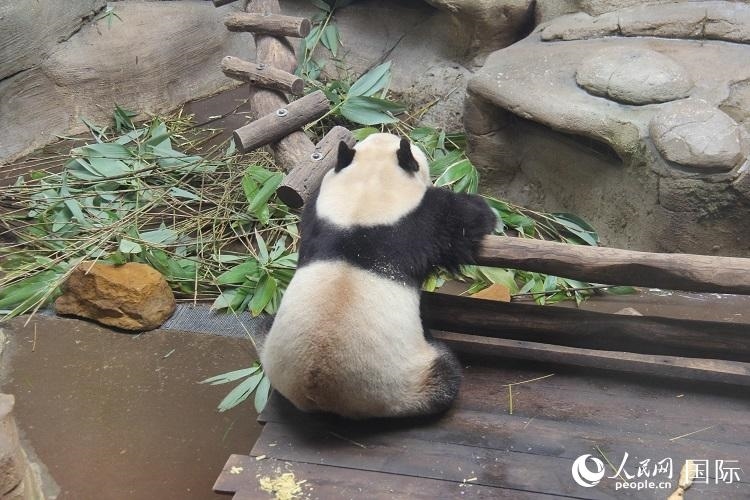記者趕到時(shí),離開(kāi)爸爸媽媽單獨(dú)生活的“圓夢(mèng)”正躺在木床上呼呼大睡,四仰八叉的可愛(ài)模樣吸引游客們紛紛駐足,拍照留念。動(dòng)物園工作人員介紹說(shuō),“圓夢(mèng)”現(xiàn)在已經(jīng)五歲多了,體重超過(guò)100公斤,身高也同成年大熊貓無(wú)差,活潑好動(dòng)、元?dú)鉂M(mǎn)滿(mǎn)。隨著飼養(yǎng)員往園內(nèi)投入新鮮的竹子,“圓夢(mèng)”也慢慢醒過(guò)來(lái),開(kāi)始享用竹子大餐?!拔铱梢砸徽煸谶@里看它吃飯!真的太可愛(ài)了!這是我在動(dòng)物園最喜歡的動(dòng)物!”今年8歲的梅麗莎興奮地說(shuō)。