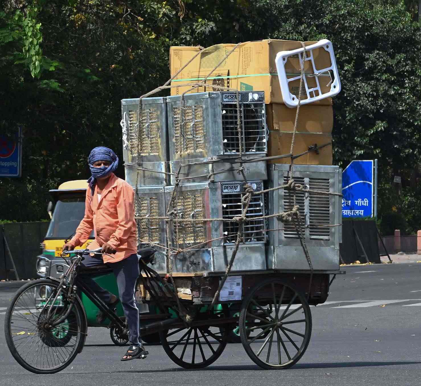 當(dāng)?shù)貢r(shí)間2023年4月16日,印度新德里,氣溫飆升至40℃以上,工人運(yùn)送冷氣機(jī)。