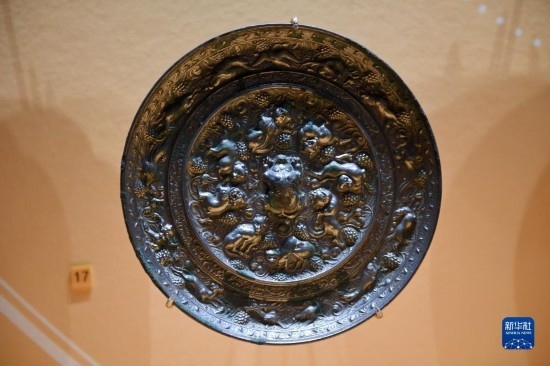 這是在西安博物院展出的唐代瑞獸葡萄紋銅鏡(5月8日攝)。葡萄、苜蓿等農(nóng)作物通過絲綢之路傳入中國。