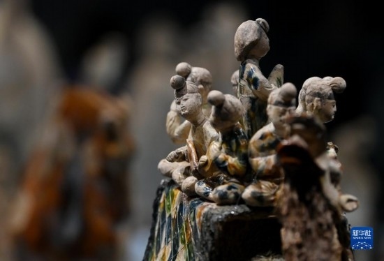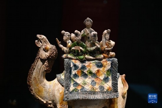 這是在陜西歷史博物館拍攝的唐三彩駱駝載樂俑(5月11日攝)。這件唐三彩駱駝載樂俑既是唐代文化藝術(shù)、制作工藝發(fā)達昌盛的重要物證,也見證了絲綢之路上藝術(shù)的交流與融合。