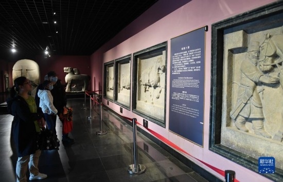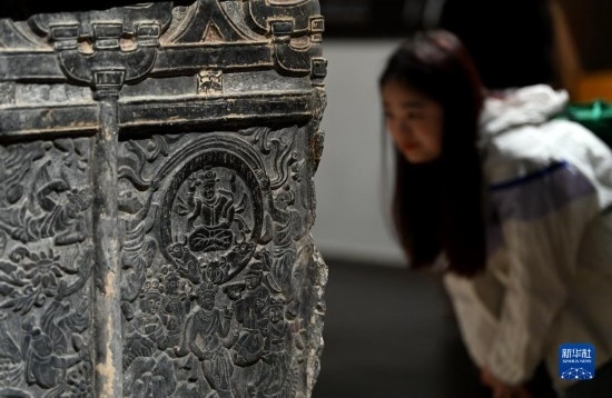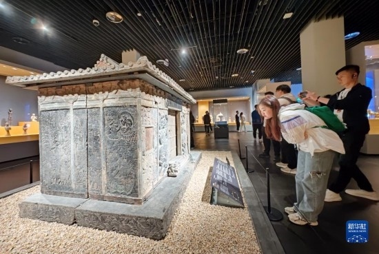 5月8日,游客在西安博物院參觀史君墓石槨。墓主史君是北周涼州薩保,粟特人。石槨整體為中國傳統(tǒng)歇山頂?shù)钐檬浇ㄖ?,四壁浮雕?nèi)容和風(fēng)格則帶有鮮明的西域特色。