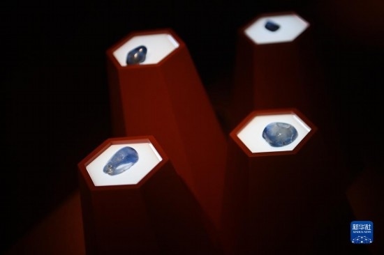 這是在陜西歷史博物館拍攝的藍寶石(5月11日攝)。天然寶石通過絲綢之路以商業(yè)貿(mào)易的形式進入中國。