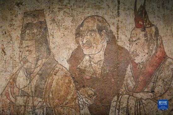 這是在陜西歷史博物館拍攝的唐章懷太子墓《客使圖》(局部)(5月11日攝)?!犊褪箞D》描繪的是唐代外交機構(gòu)鴻臚寺官員接待外國使節(jié)的場景。