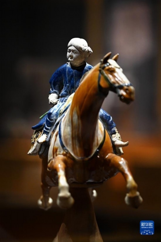 這是在西安博物院展出的唐代三彩騰空馬(5月8日攝)。飛騰的三彩馬上騎有一胡俑,真實再現(xiàn)了絲綢之路上西域胡人急奔長安的生動形象。
