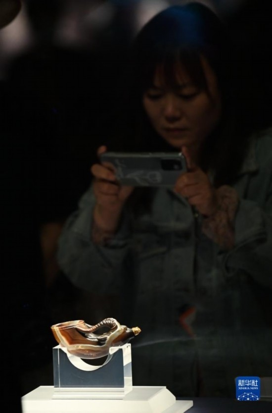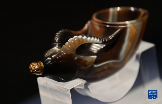 5月11日,游客在陜西歷史博物館參觀鑲金獸首瑪瑙杯。鑲金獸首瑪瑙杯的造型,與起源于古希臘的酒具“來通”相似,“來通”曾廣泛流行于中亞、西亞地區(qū),沿著絲綢之路不斷東傳進入中國。