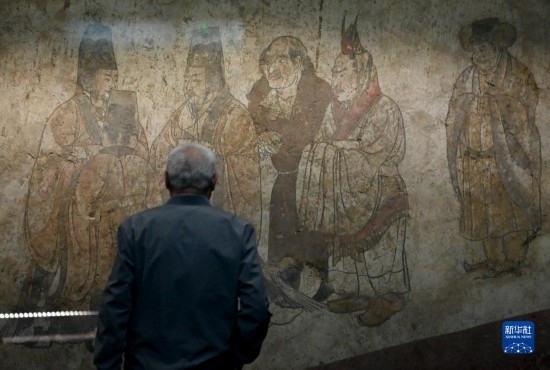 5月11日,游客在陜西歷史博物館內(nèi)觀看唐章懷太子墓《客使圖》。《客使圖》描繪的是唐代外交機構(gòu)鴻臚寺官員接待外國使節(jié)的場景。