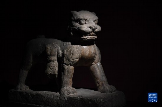 這是在西安碑林博物館拍攝的唐代石獅(5月9日攝)。古代中國的獅子多通過絲綢之路由外國進貢而來。