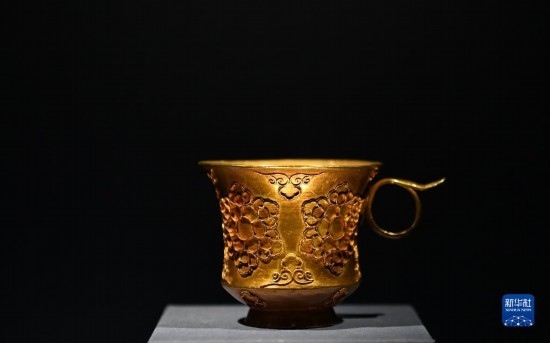 這是在陜西歷史博物館拍攝的掐絲團花紋金杯(5月11日攝)。唐代帶把杯除部分器物直接來自中亞粟特,還有部分屬于唐人仿制粟特風(fēng)格的作品,這些物品都是東西方文明通過絲綢之路進行交流互鑒的的珍貴物證。