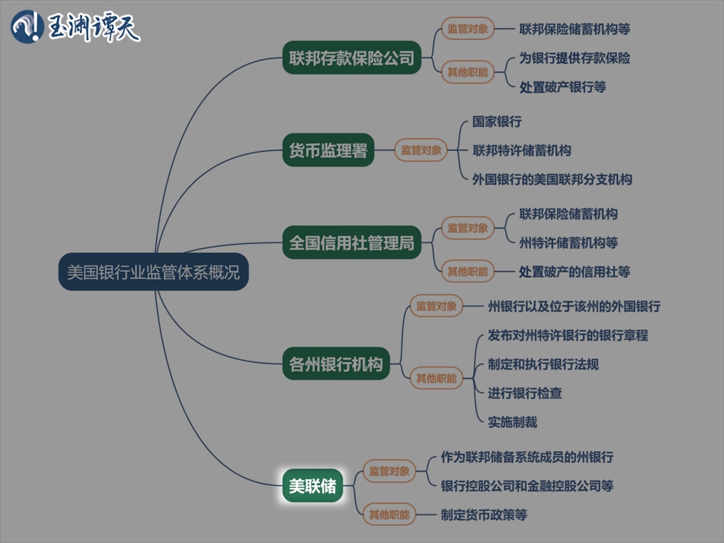 讓我們重新看回這張圖,可以看到,按照美國銀行業(yè)監(jiān)管體系的分工,美聯(lián)儲負責監(jiān)管所有成員銀行的正常運行。