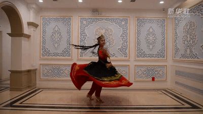 “左旋右轉(zhuǎn)不知疲,千匝萬(wàn)周無(wú)已時(shí)。人間物類(lèi)無(wú)可比,奔車(chē)輪緩旋風(fēng)遲?!背錆M(mǎn)活力的跳躍和旋轉(zhuǎn)是胡旋舞最顯著的特征。而經(jīng)過(guò)千年的融合與傳承,這一元素已深深融入到中國(guó)和中亞國(guó)家多種舞蹈形式當(dāng)中。