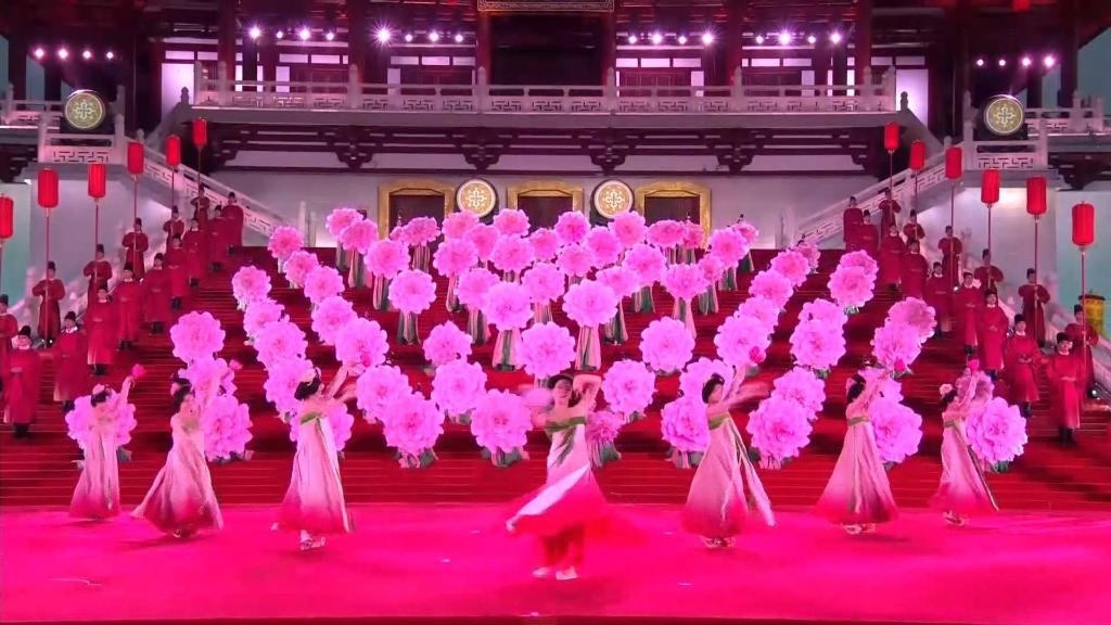 紫云樓前,禮樂和鳴,明快有力的古代佾舞、絢麗婀娜的芙蓉花舞,表達了古都西安人民的熱情好客,體現(xiàn)了中華文化兼容并蓄的精神風貌。