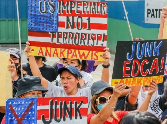 4月11日,在菲律賓首都大馬尼拉地區(qū)奎松城,民眾參加集會活動,抗議菲律賓和美國軍方舉行聯(lián)合軍事演習(xí)。新華社發(fā)(烏馬利攝)