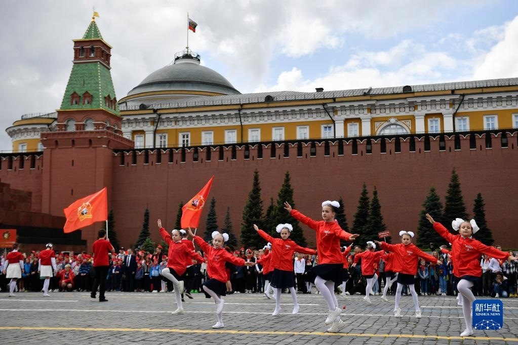 5月21日,在俄羅斯首都莫斯科,孩子們在少先隊入隊儀式上表演。