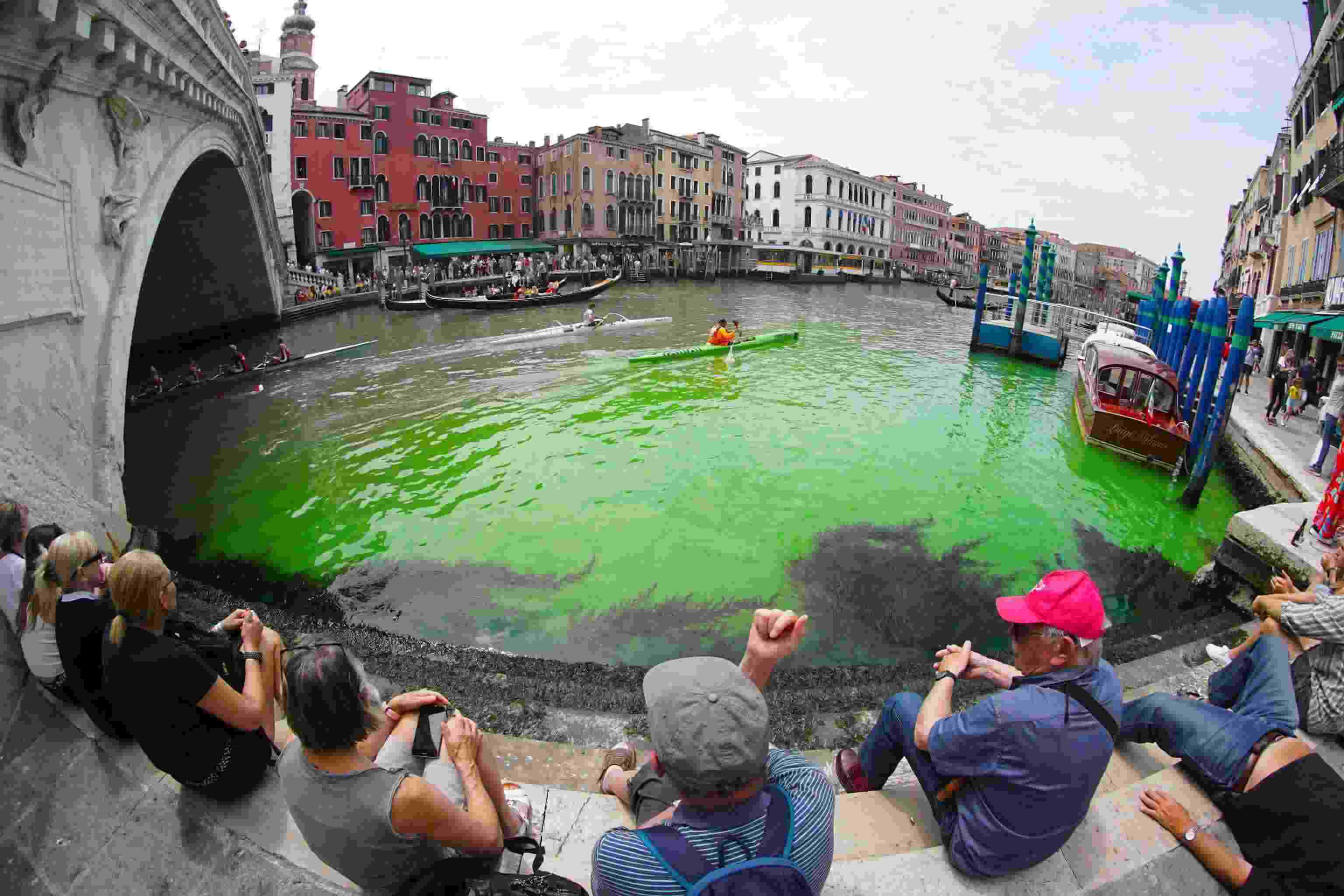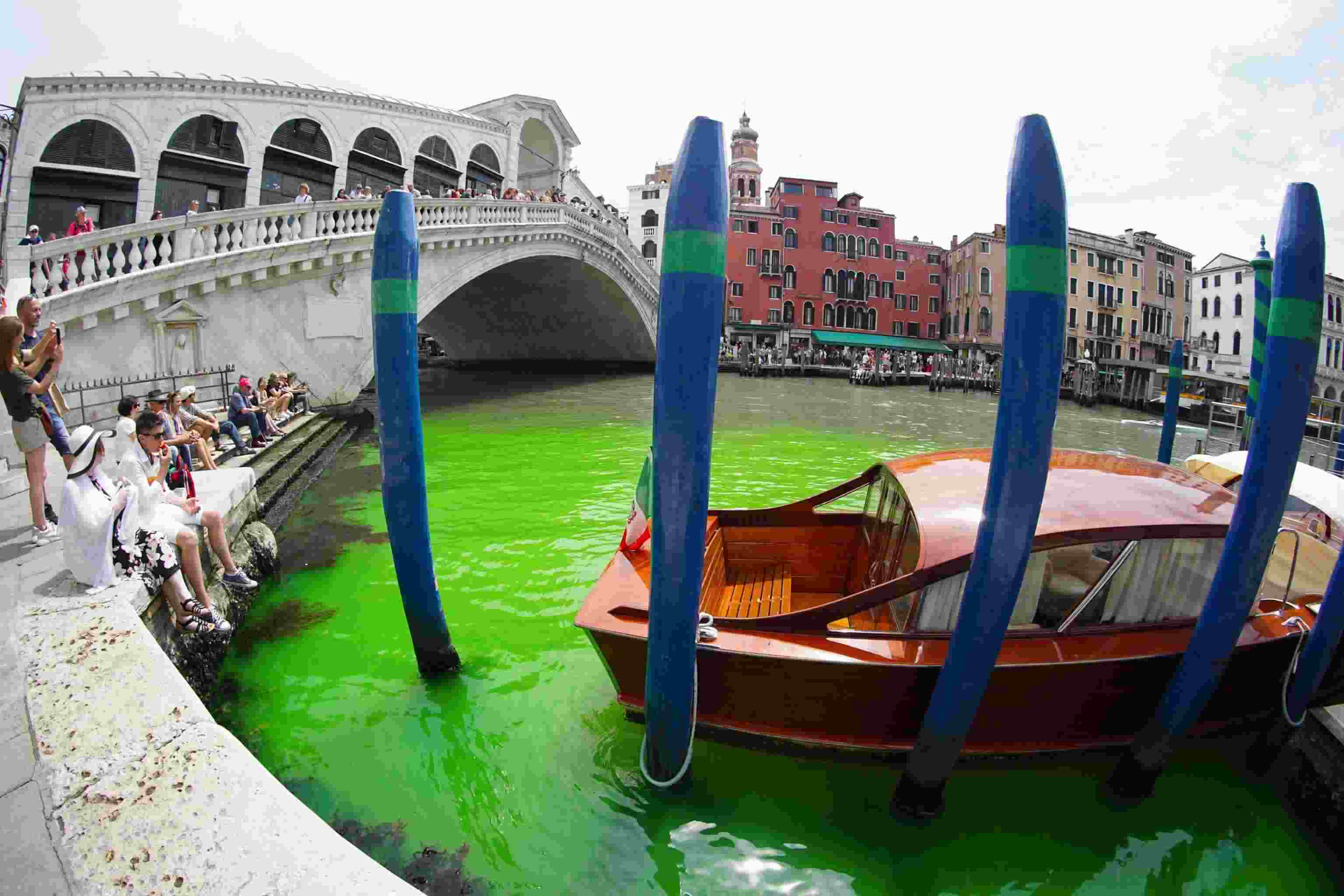 當(dāng)?shù)貢r(shí)間2023年5月28日,意大利威尼斯大運(yùn)河里亞托橋附近水域變成了熒光綠的顏色,警方等部門已經(jīng)介入調(diào)查,尋找原因。 視覺中國(guó)