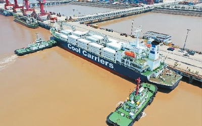 去年以來(lái),浙江省玉環(huán)市持續(xù)加強(qiáng)對(duì)港口企業(yè)的引導(dǎo)力度,拓展大麥嶼港與東南亞國(guó)家、RCEP國(guó)家的合作。圖為一艘滿載6245噸新季獼猴桃的新西蘭貨輪停泊在大麥嶼港集裝箱碼頭,該航線是大麥嶼港于去年成功開通的RCEP國(guó)家水果進(jìn)口航線,實(shí)現(xiàn)了入境水果業(yè)務(wù)零的突破。段俊利攝(人民視覺)
