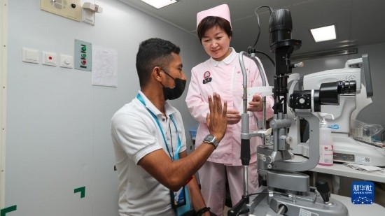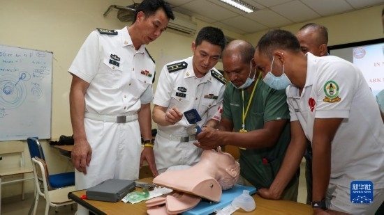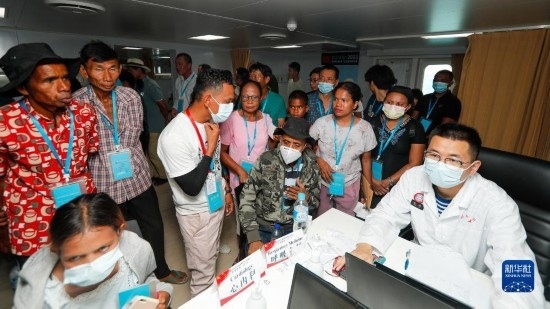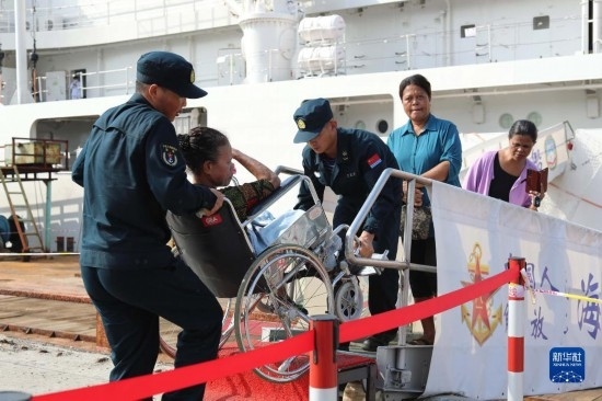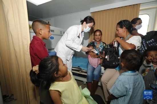 中國海軍“和平方舟”號醫(yī)院船訪問東帝汶并開展醫(yī)療服務(wù)期間,醫(yī)院船官兵為當(dāng)?shù)匦袆硬槐愕幕颊叻?wù)(9月6日攝)。新華社發(fā)(桂江波 攝)