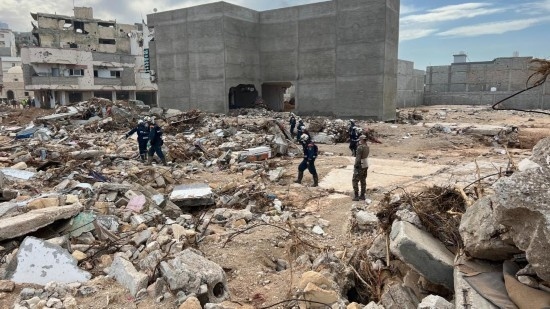 9月17日,國際救援人員在利比亞德爾納的建筑廢墟上工作。新華社發(fā)(哈姆扎·圖爾基亞攝)