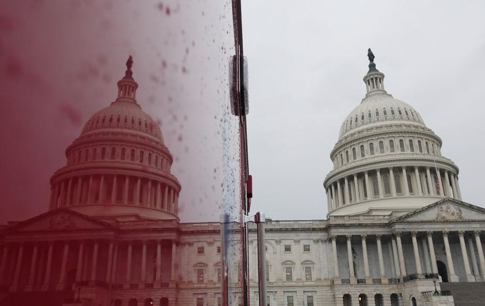 這張2018年12月28日拍攝的資料照片顯示,在美國華盛頓,國會大廈映在一輛汽車上。新華社記者劉杰攝