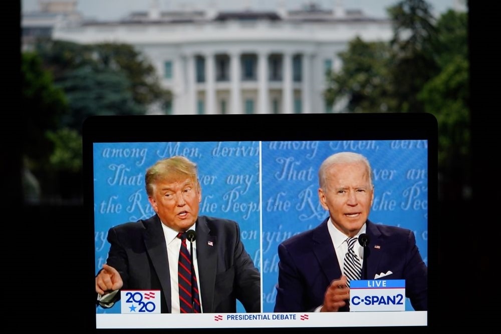 這張2020年9月29日在美國弗吉尼亞州阿靈頓拍攝的視頻畫面顯示,時任美國總統(tǒng)特朗普(左)與美國民主黨總統(tǒng)候選人拜登在俄亥俄州克利夫蘭市參加2020年美國總統(tǒng)候選人首場電視辯論。新華社記者劉杰攝