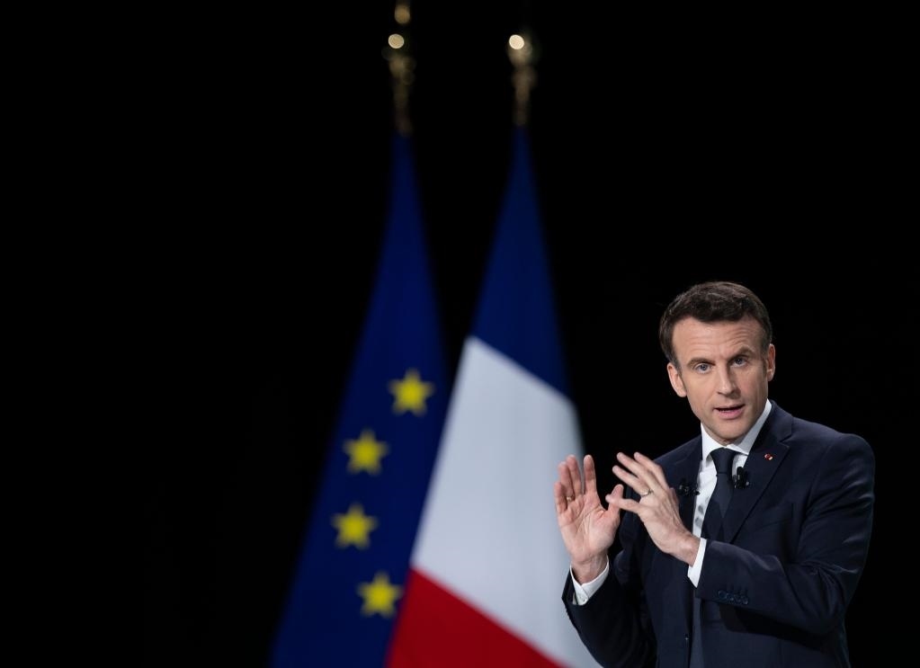 2022年3月17日,法國總統(tǒng)馬克龍在巴黎北郊塞納-圣但尼省舉行的新聞發(fā)布會上介紹競選綱領。新華社發(fā)(肖恩·洛朗攝)