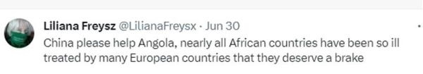 網(wǎng)友利利安娜·弗賴斯直呼:“中國(guó)請(qǐng)幫助安哥拉,幾乎所有非洲國(guó)家都忍受過(guò)歐洲國(guó)家的糟糕對(duì)待,它們?cè)撚瓉?lái)轉(zhuǎn)機(jī)了?!?/p>