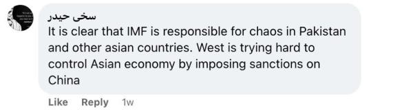 還有網(wǎng)友留言說(shuō):“國(guó)際貨幣基金組織對(duì)巴基斯坦和其他亞洲國(guó)家的混亂負(fù)有責(zé)任,這一點(diǎn)再清楚不過(guò)了。西方試圖通過(guò)制裁中國(guó)來(lái)控制亞洲經(jīng)濟(jì)?!?/p>