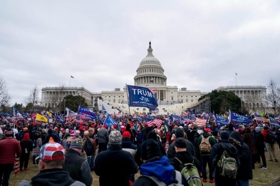 2021年1月6日,在美國首都華盛頓的國會大廈前,時(shí)任總統(tǒng)特朗普的支持者舉行示威游行。部分示威者沖擊國會大廈,導(dǎo)致國會參眾兩院認(rèn)證總統(tǒng)選舉結(jié)果的聯(lián)席會議中斷數(shù)小時(shí)。事件造成4名示威者和1名國會警察死亡。新華社記者劉杰攝