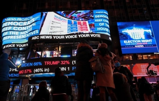 2020年11月3日,人們在美國紐約時(shí)報(bào)廣場觀看總統(tǒng)選舉實(shí)時(shí)計(jì)票結(jié)果。新華社記者王迎攝