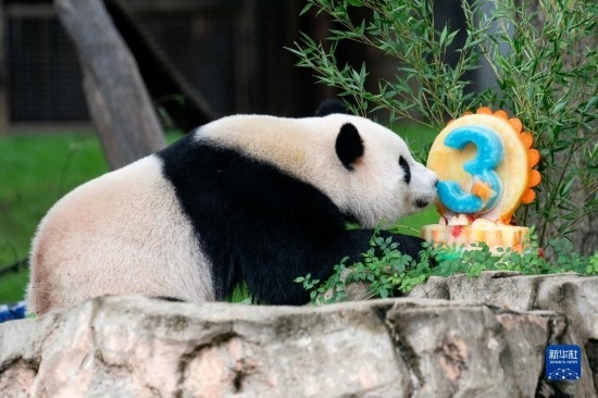 8月21日,大熊貓幼崽“小奇跡”在美國首都華盛頓史密森學(xué)會(huì)國家動(dòng)物園享用生日蛋糕。新華社記者 劉杰 攝