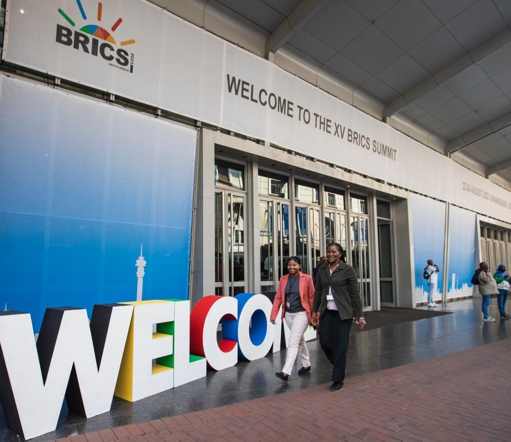 8月20日,在南非約翰內(nèi)斯堡,行人走過金磚國家領(lǐng)導(dǎo)人第十五次會晤舉辦場所桑頓會展中心。新華社記者張譽(yù)東攝