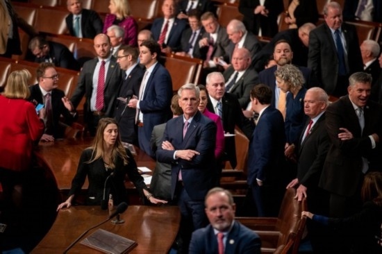 這是1月6日在美國華盛頓國會拍攝的凱文·麥卡錫(中)。新華社記者劉杰攝