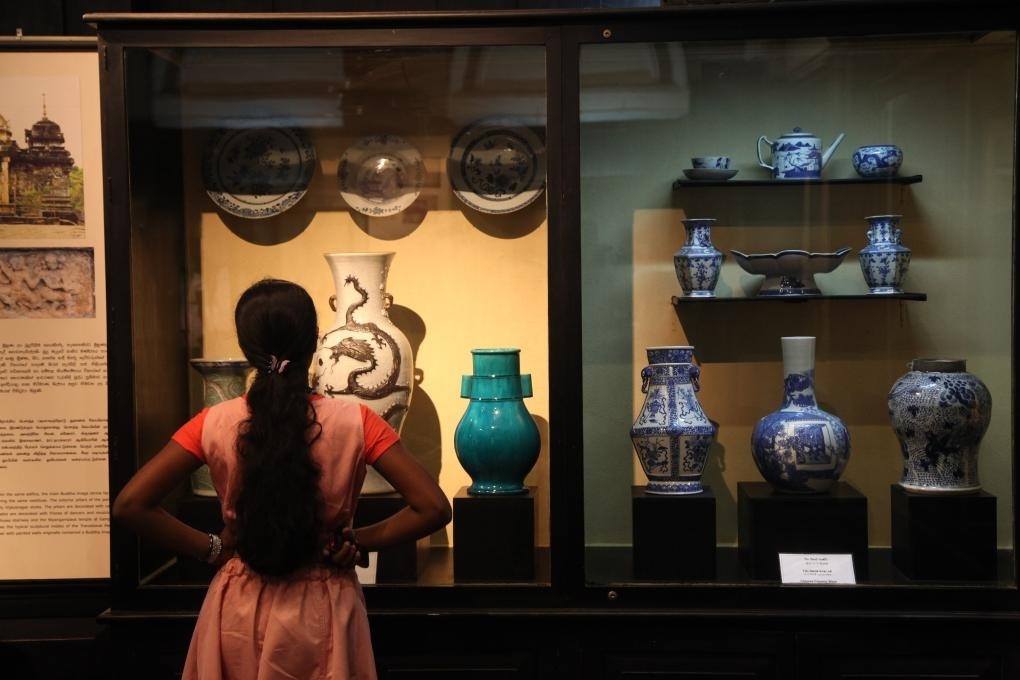 2014年9月15日,在斯里蘭卡首都科倫坡,游客參觀斯里蘭卡國家博物館展出的當(dāng)?shù)爻鐾恋闹袊糯善鳎恍┲袊怃N瓷器上還繪有南亞、伊斯蘭風(fēng)情,與鄭和碑共同見證著古代海上絲綢之路和中斯友好交往的源遠(yuǎn)流長。 新華社記者馮武勇攝