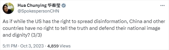 “仿佛美國有權(quán)利散布虛假信息,而中國等國家卻無權(quán)說實話、維護國家形象和尊嚴?”