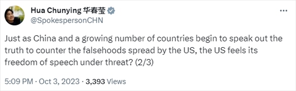 “當中國和越來越多的國家開始講真話反擊美國的謊言時,美國卻感到自己的言論自由受到威脅?”