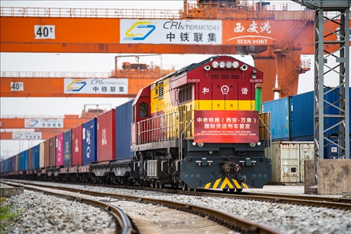 2022年4月22日,陜西西安首趟中老鐵路(西安至萬象)國際貨運(yùn)列車從西安國際港站發(fā)車。新華社記者 劉翔 攝