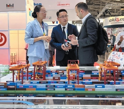 在2023年慕尼黑國(guó)際物流博覽會(huì)上,工作人員在中鐵集裝箱運(yùn)輸有限公司展臺(tái)前向國(guó)外客戶(hù)介紹廣州國(guó)際港中歐班列站點(diǎn)設(shè)施。本報(bào)記者 李 強(qiáng)攝