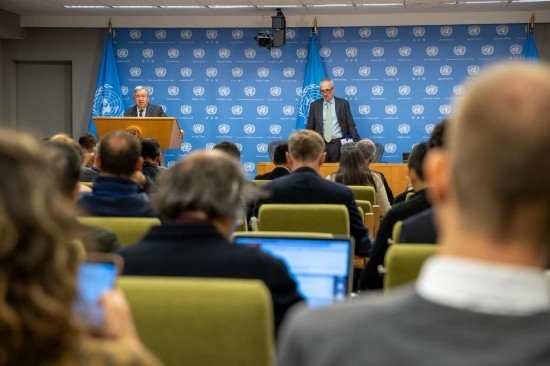 10月9日,在位于紐約的聯(lián)合國(guó)總部,聯(lián)合國(guó)秘書長(zhǎng)古特雷斯(后左)在記者會(huì)上就巴以局勢(shì)發(fā)表談話。新華社發(fā)(聯(lián)合國(guó)供圖/保羅·菲爾蓋拉斯攝)