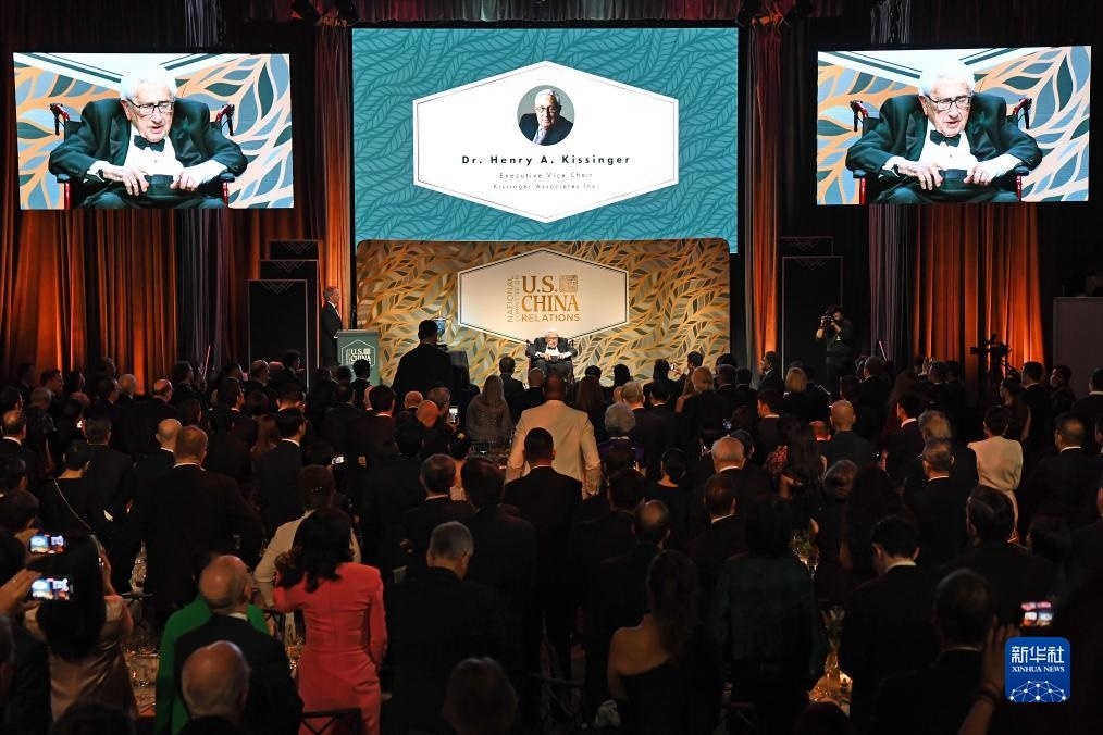 10月24日,美國(guó)前國(guó)務(wù)卿基辛格(中)出席在紐約舉行的美中關(guān)系全國(guó)委員會(huì)年度頒獎(jiǎng)晚宴。新華社記者 李睿 攝