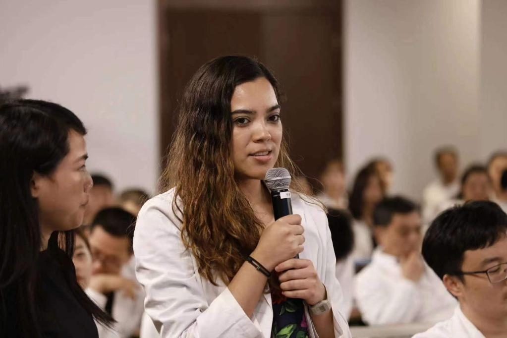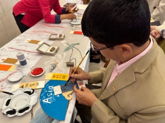 嘉賓體驗(yàn)中國(guó)書(shū)法書(shū)寫(xiě)過(guò)程 (新華社記者王艷剛攝)