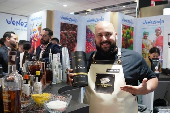 11月7日,展商在第六屆進博會國家展委內瑞拉展臺展示朗姆酒。新華社記者 李夢嬌 攝