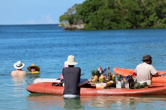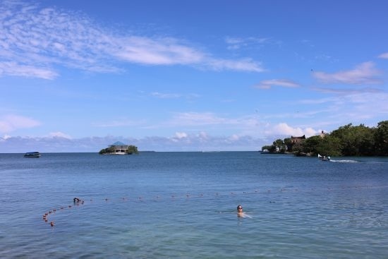 游客在卡塔赫納港口的海水中游泳。唐薇 攝
