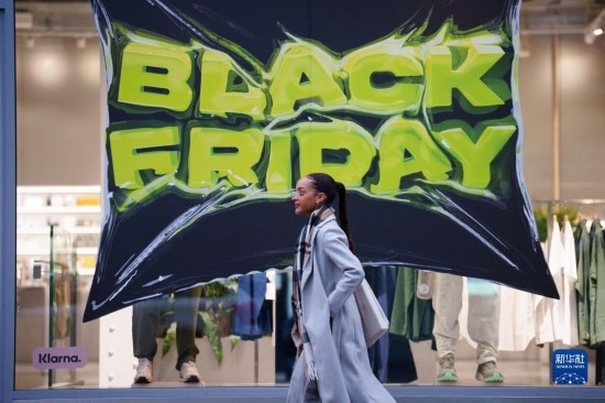 11月22日,在英國(guó)曼徹斯特,一名女子走過(guò)“黑色星期五”促銷廣告。新華社發(fā)(喬恩·休珀攝)