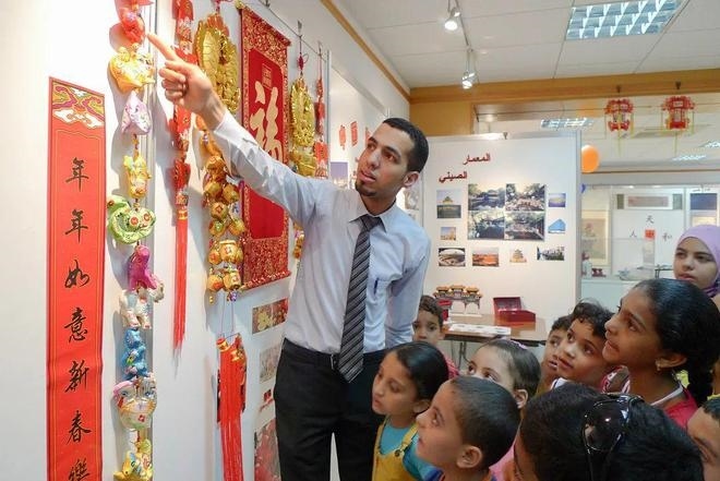 一位埃及青年正認真向圍在身邊的學生們講解中國傳統(tǒng)文化中的十二生肖。他身穿白色襯衫,系著條紋領(lǐng)帶,學生們仰起頭,專心致志地聆聽講解。這位埃及青年便是時年28歲的阿巴斯。作為開羅中國文化中心主任助理,他經(jīng)常在這里向埃及學生和民眾介紹中國的文房四寶和京劇臉譜,講解中國的傳統(tǒng)節(jié)日和風景名勝,并帶領(lǐng)孩子們做手工,燈籠、風箏和寫對聯(lián)往往是他們最喜愛的內(nèi)容。在當年埃及的動蕩時局下,中國文化中心照常對外開放,各種活動有序開展。首屆大使杯“魅力埃及,多彩中國”攝影大賽作品展就吸引了上百名開羅市民前往參觀。