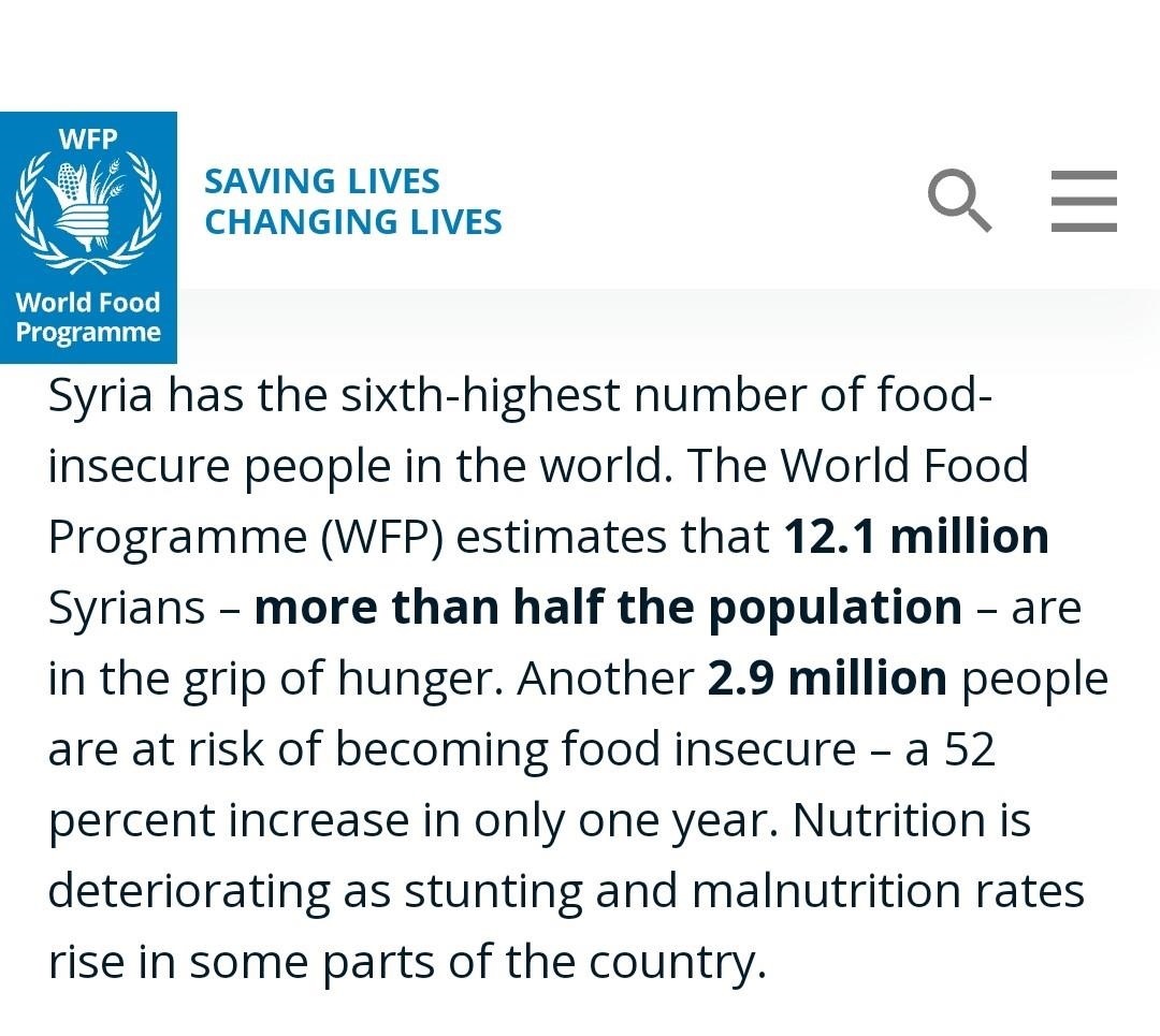 盡管敘政府仍保有部分農田的控制權,但西方制裁對金融和貿易的限制使得化肥、種子、農藥、飼料、農機零配件等無法進入敘利亞境內。歷史上的敘利亞是小麥出口國,而如今的政府卻不得不使用非常寶貴的外匯來進口大量小麥,財政負擔因此而大大增加。即便如此,世界糧食計劃署的數據仍顯示,敘利亞境內約有一半以上人口面臨糧食不安全,240萬人面臨著嚴重的營養(yǎng)危機。