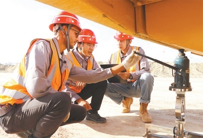 在阿布基爾集裝箱碼頭項目,中方員工向埃方新入職員工(左)講授級配碎石檢測知識。史筱迪攝