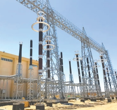 位于蘇伊士省的埃克薩迪亞500千伏變電站項目現(xiàn)場,鐵塔高聳,一條條高壓輸電導線接入變電站設備,電流通過導線時發(fā)出嗡嗡聲。