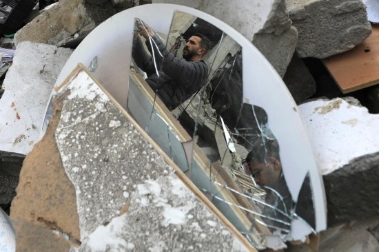 1月17日,在加沙地帶南部城市拉法,查看以軍空襲后受損建筑的人們的身影倒映在破裂的鏡面上。新華社發(fā)(亞西爾·庫迪攝)
