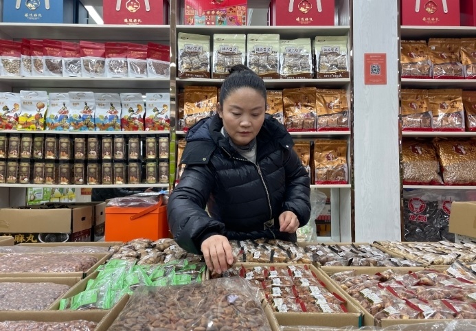 這是湖南長(zhǎng)沙高橋大市場(chǎng)堅(jiān)果經(jīng)銷商李海麗在整理貨物。新華社記者 余春生 攝